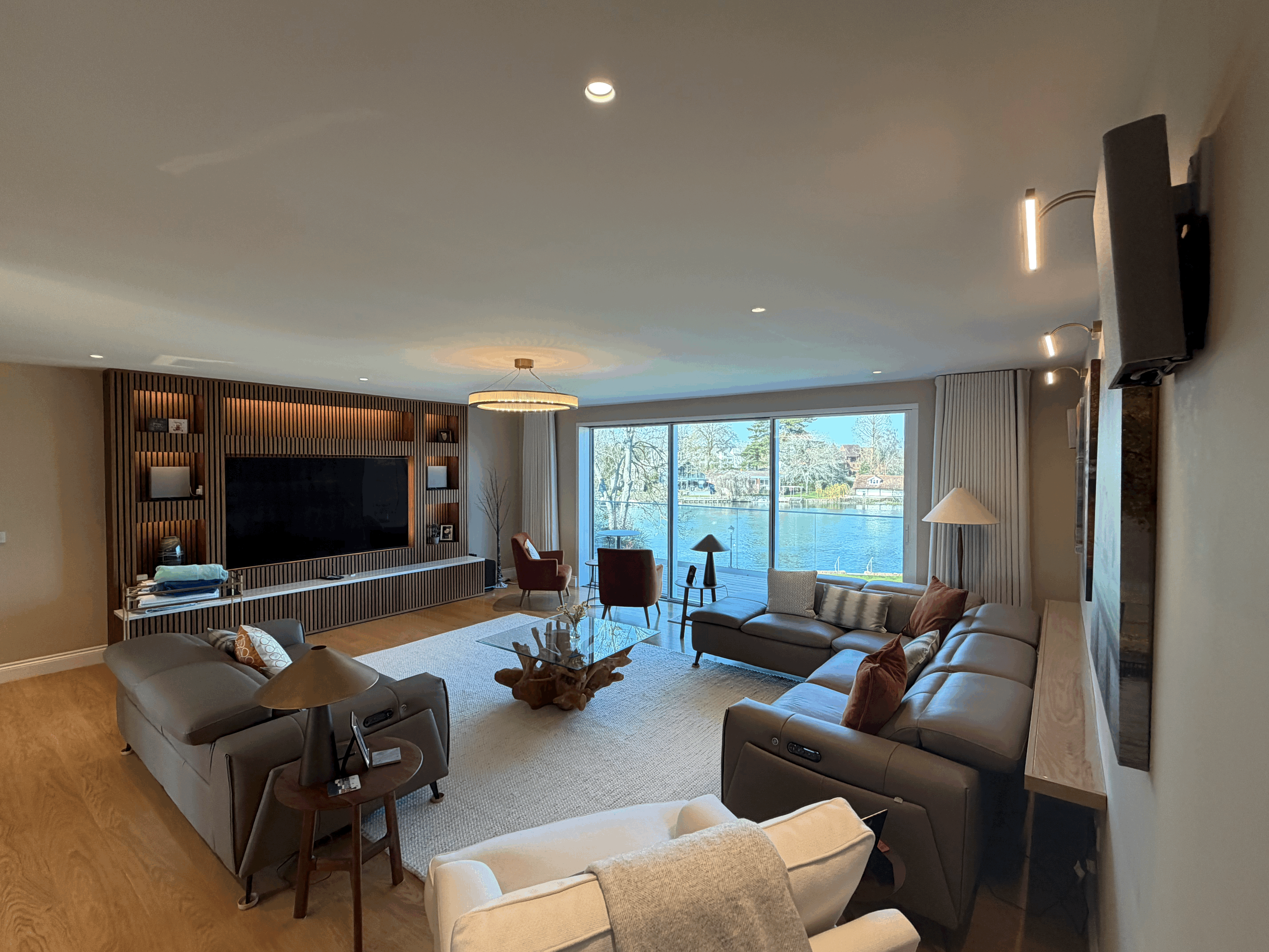 Full interior decorating across multiple reception rooms in a high-end riverside property. Specialist colour work including sage green feature walls, crisp white ceilings